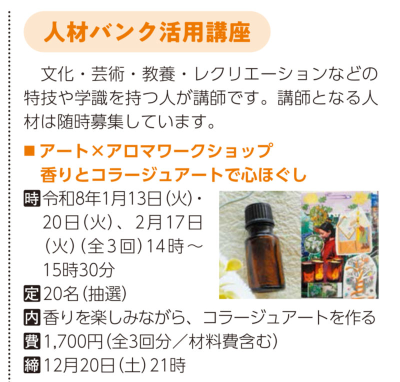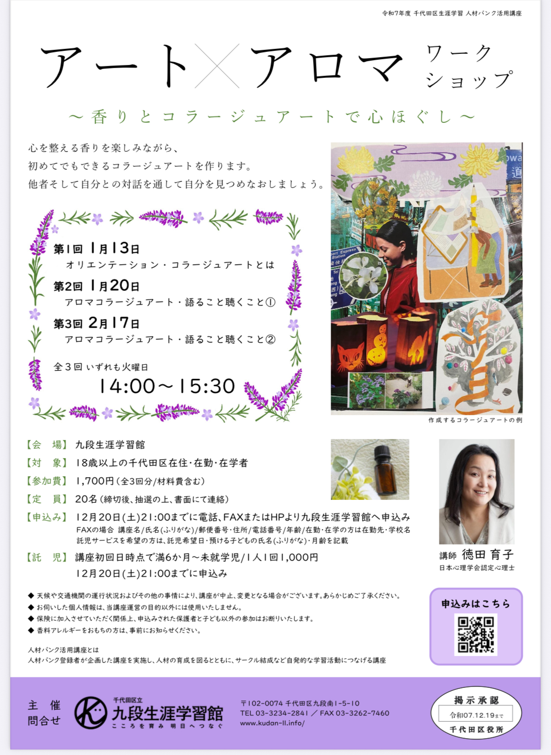2026年1月13日から全3回講座で開催される千代田区立九段生涯学習館主催のアートアロマワークショップに講師として登壇することとなりました。