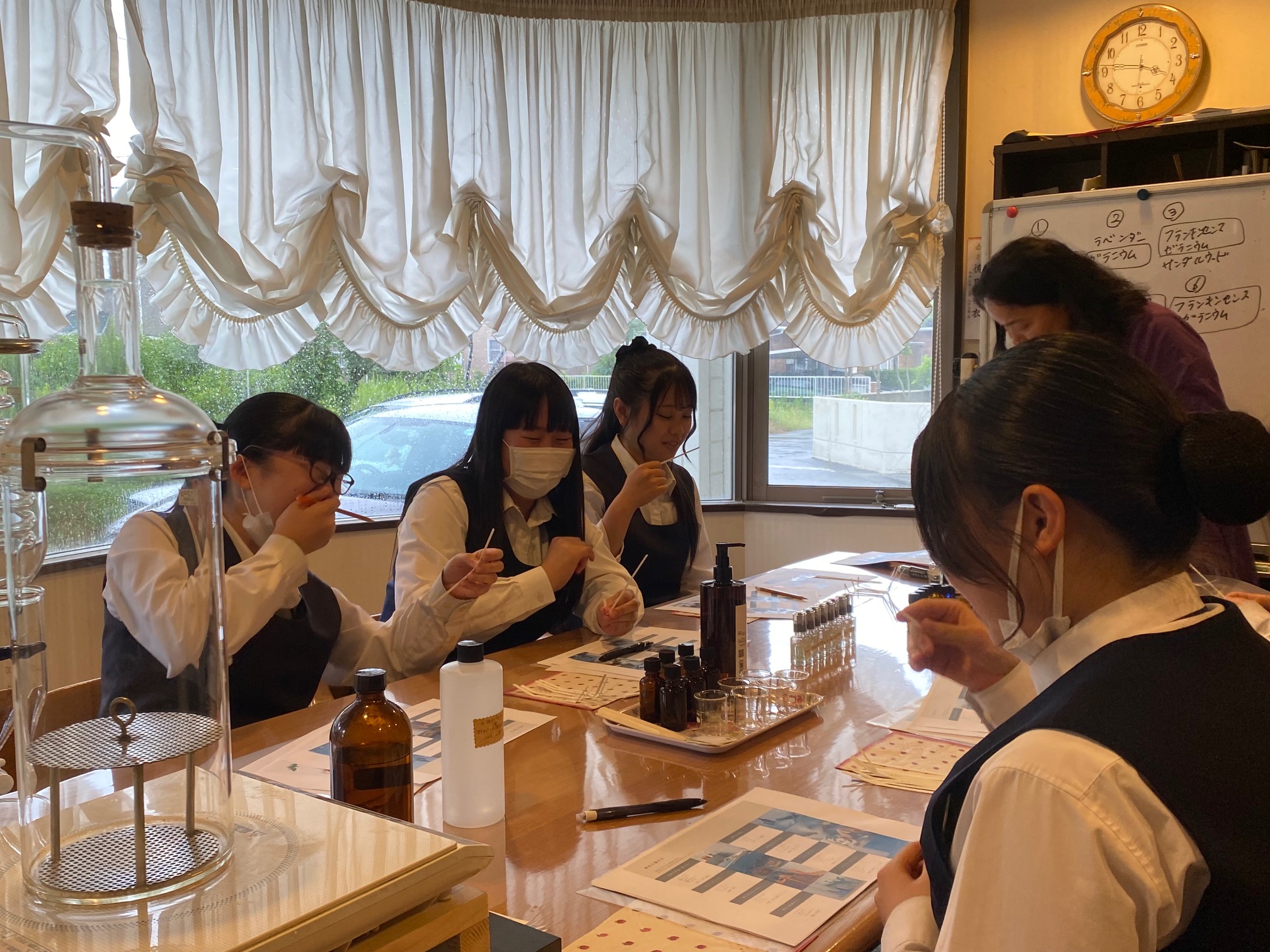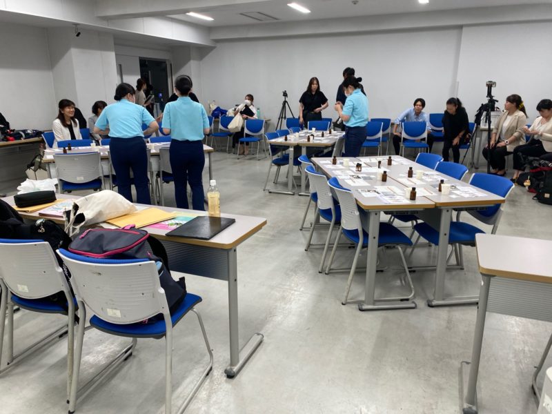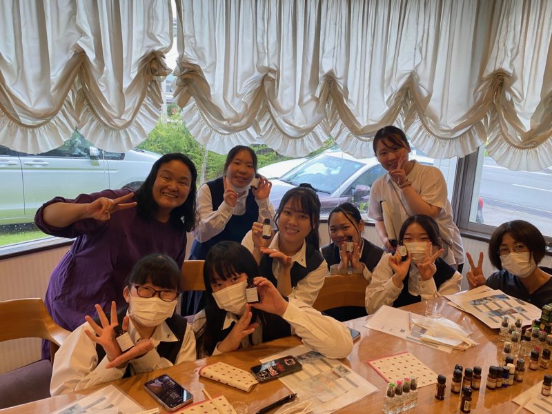 事前準備のため7月14日に福祉科の生徒6名と教員2名、合計8名が当スクールに来校していただき2時間にわたって当日使用する精油を決めたり